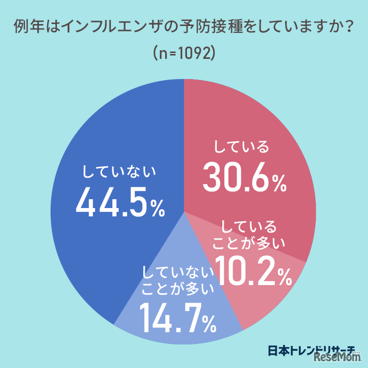 新型コロナワクチンの3回目接種が話題となる中、NEXERが運営する日本トレンドリサーチは、インフルエンザ予防接種に関するアンケート結果を公開。2021年は、60.4%がインフルエンザ予防接種を「しようと思わない」と回答した。