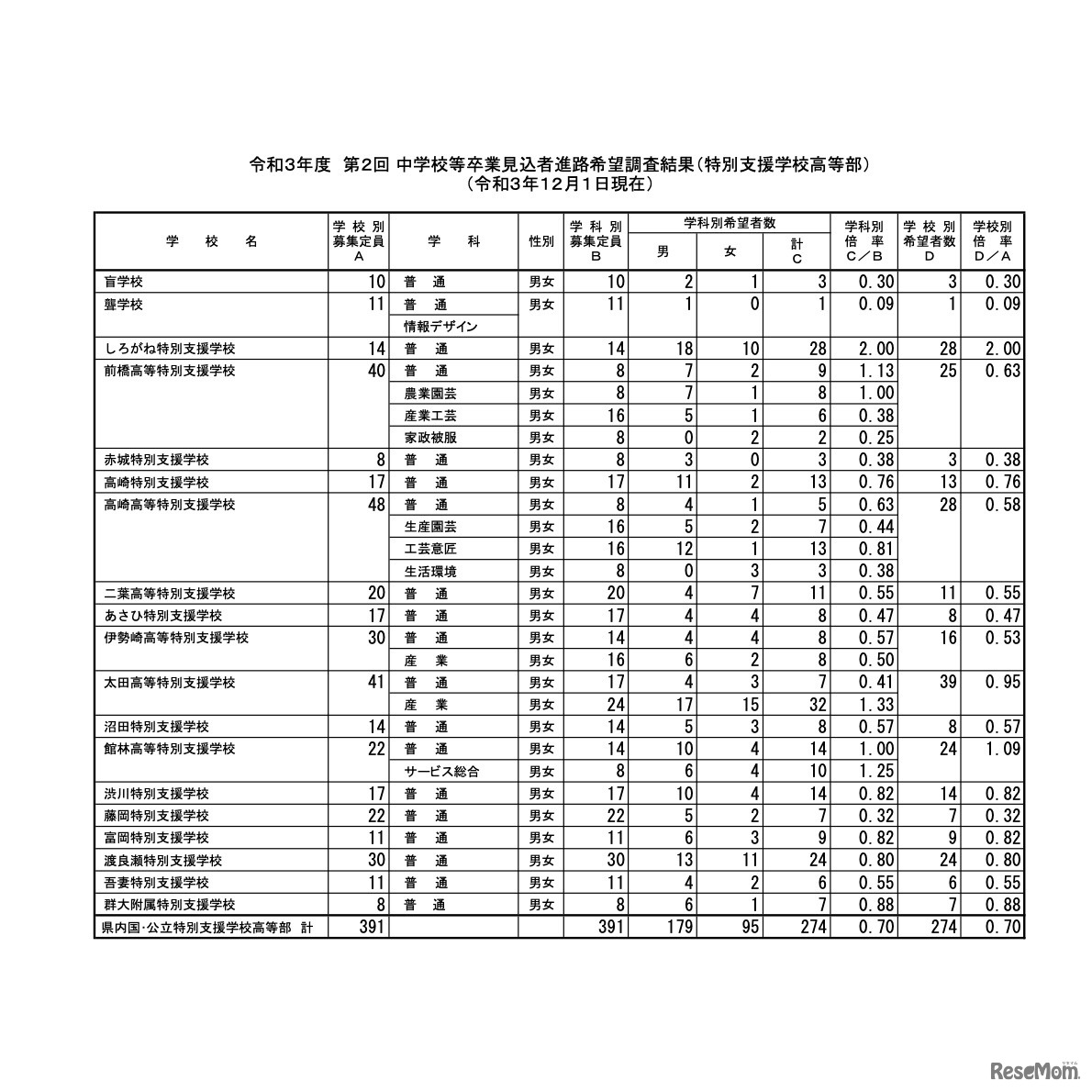 群馬県教育委員会は、令和3年度(2021年度)第2回「中学校等卒業見込者進路希望調査」の結果を公表した。県内公立高校の全日制・フレックススクールへの進学希望者は1万2,182人で、倍率は1.01倍。第1回調査(10月1日時点)より希望者数が847人減少した。