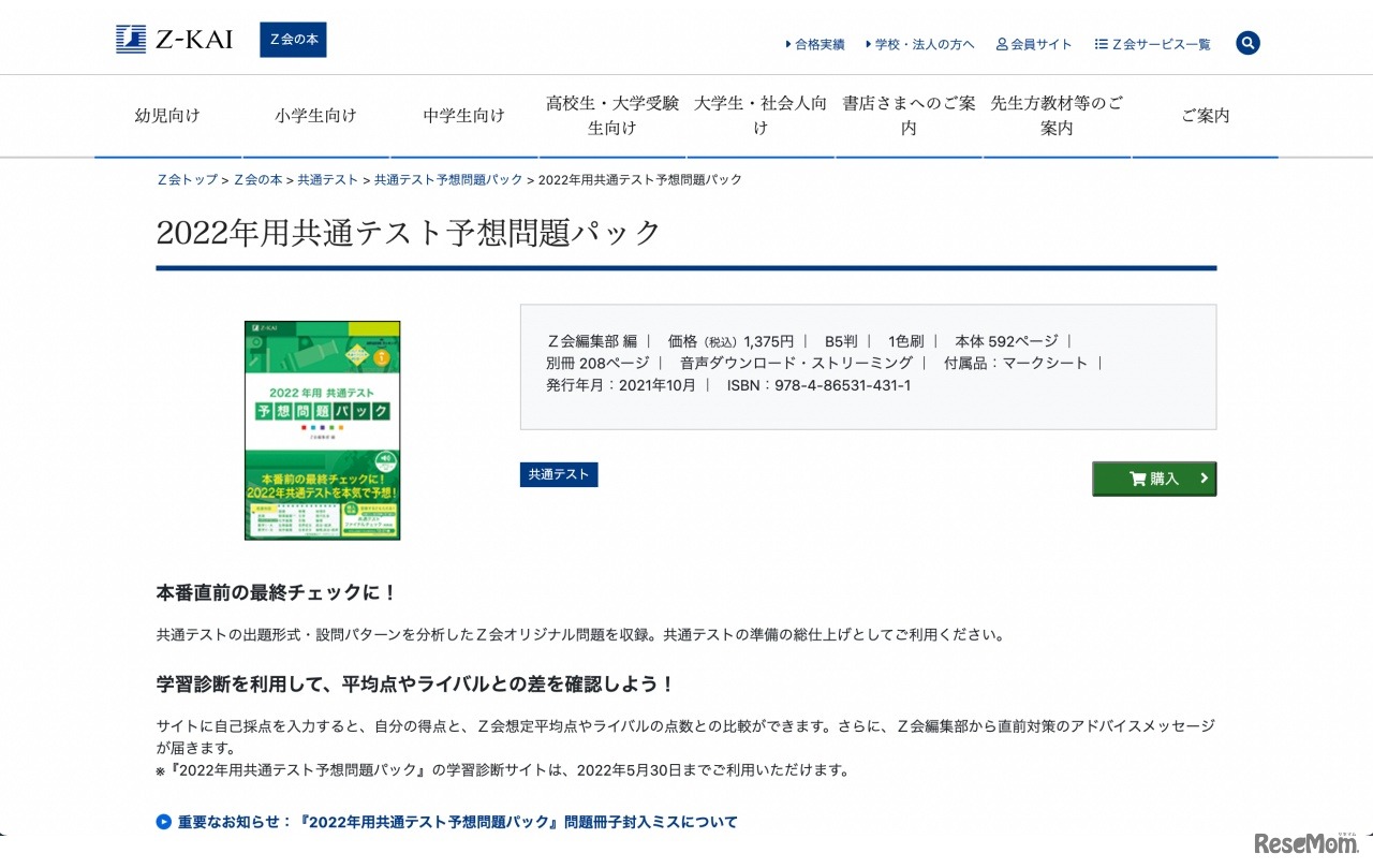 Z会は2021年12月17日、10月に発売した「2022年用共通テスト予想問題パック」の一部において、数学IAの問題が封入されていない事例が発生していると公表した。Webサイト上に数学IAの問題のPDFを掲載し、急ぎの場合はダウンロードして利用してほしいとしている。