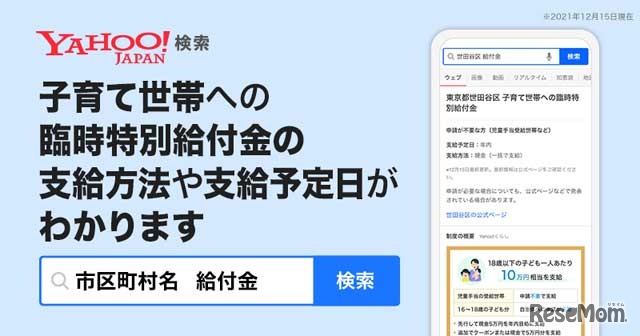Yahoo!JAPANは2021年12月17日、「Yahoo!検索」で「市区町村名+給付金」と検索すると子育て世帯への臨時特別給付金の支給方法や支給予定日を掲出する取組みを開始した。各自治体で異なる給付金の支給方法や支給日、申請方法等を確認できる。