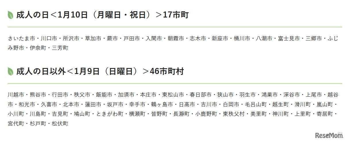 埼玉県は2021年12月20日、2022年の成人式に関する調査結果を公表した。県内63市町村のうち、46市町村が1月9日、17市町が1月10日に成人式を実施する。2021年は成人式を中止した自治体もあったが、2022年に「中止する」と回答した自治体はなかった。