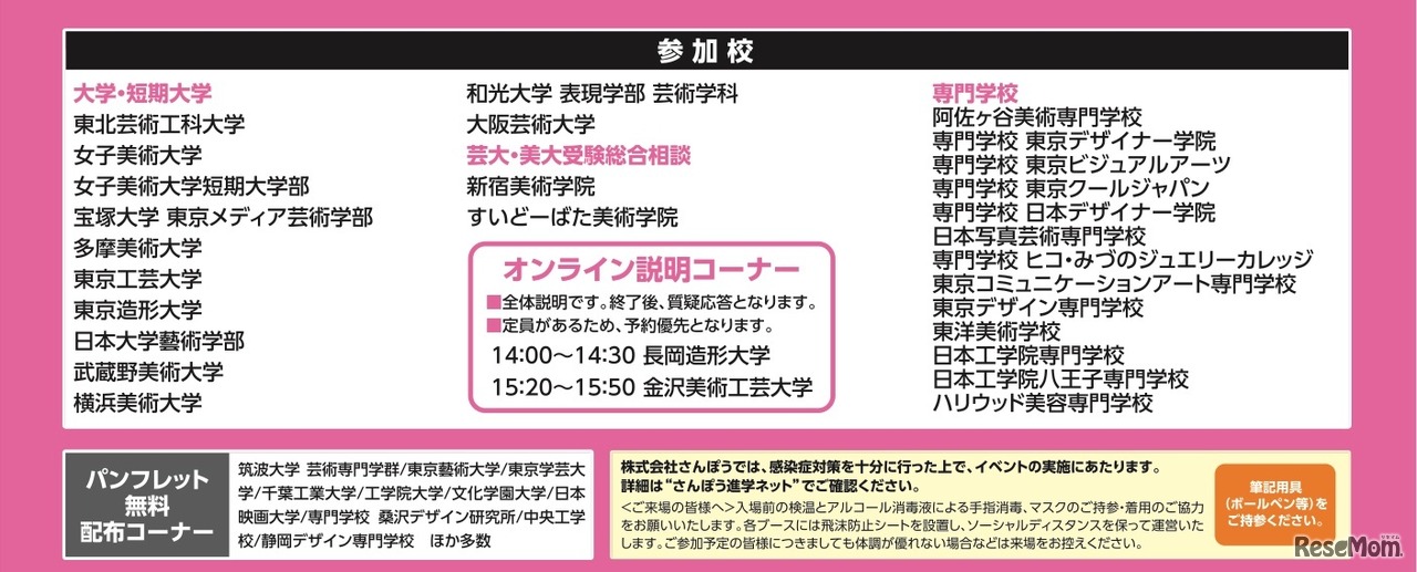 さんぽうは2022年2月26日、中高生を対象とした「アート×デザイン×クリエイティブ進学フェア」を東京都内で行う。対面では27校、オンライン説明会には2校、パンフレット配布には10校以上多数が参加する。