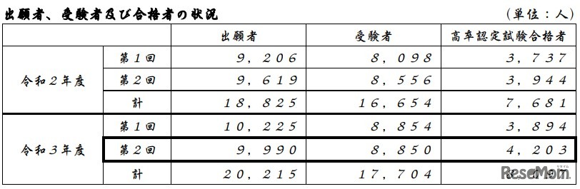 文部科学省は2021年12月21日、2021年度(令和3年度)第2回高等学校卒業程度認定試験(高卒認定試験)の結果を公表した。前年度比294人増の8,850人が受験し、高卒認定試験合格者数は前年度比259人増の4,203人だった。