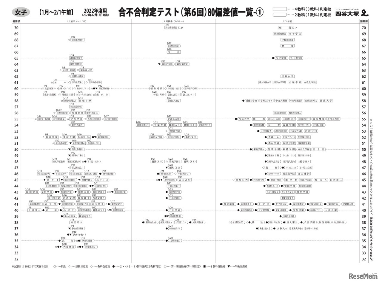 四谷大塚は、2021年12月12日に実施した小学6年生対象「第6回合不合判定テスト」の偏差値一覧を公表した。難関校の合格可能性80%偏差値は、男子が筑波大駒場(73)、開成(71)、女子が桜蔭(71)、豊島岡女子学園(70)、等。12月12日実施の第6回が最終回となる。