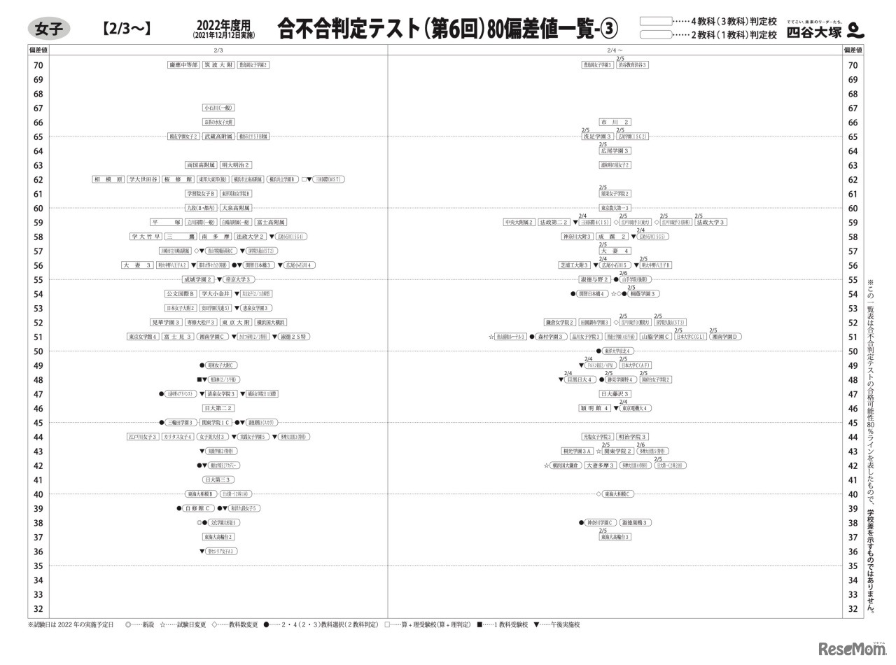 画像出典:四谷大塚「第6回 合不合判定テスト」結果偏差値 80偏差値一覧【女子・2/3~】