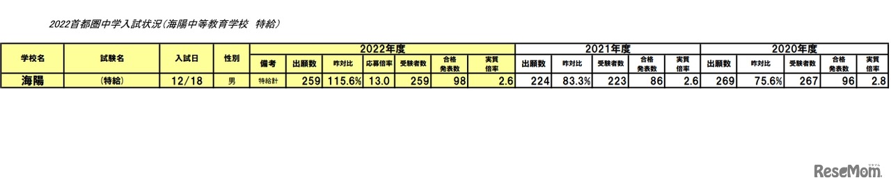 海陽中等教育学校は2021年12月18日、「特別給付生入試」を実施し、合格発表を行なった。募集人員約20名に対して259名が出願、受験し、合格者は98名。実質倍率は2.64倍。