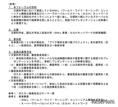 文部科学省は2021年12月20日、WWL(ワールド・ワイド・ラーニング)コンソーシアム構築支援事業とスーパーグローバルハイスクール(SGH)の高校生が参加する全国高校生フォーラムの受賞校8校が決定したと発表。文部科学大臣賞には立命館宇治高校が選ばれた。