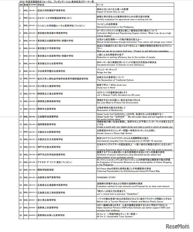 全国高校生フォーラムプレゼンテーション参加校およびテーマ一覧