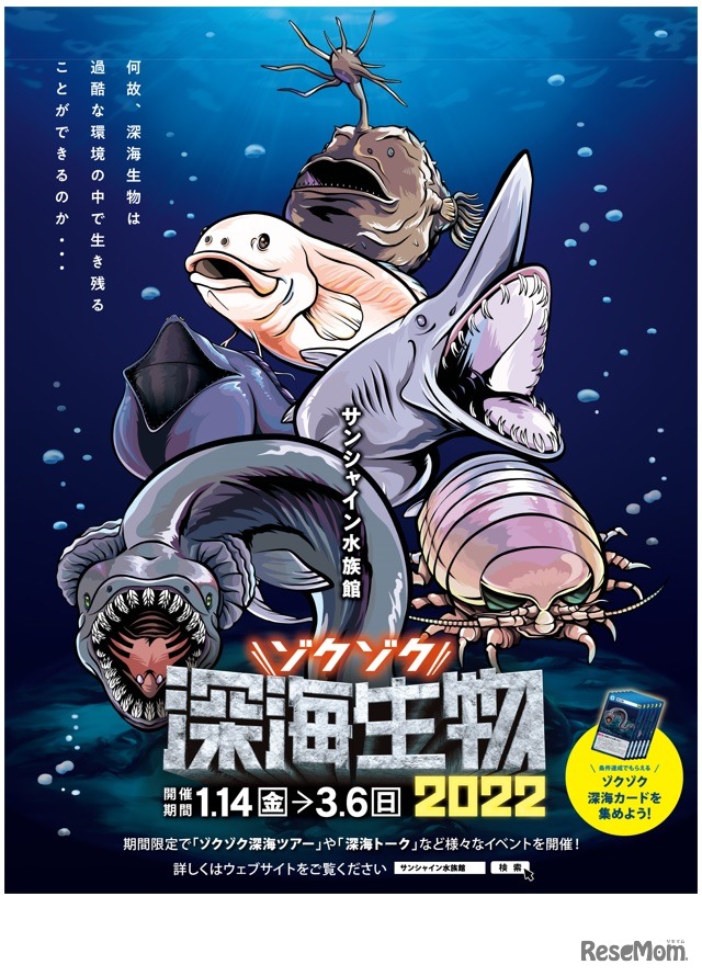 サンシャイン水族館は、2022年1月14日から3月6日の期間、深海生物イベント「ゾクゾク深海生物2022」を開催する。生体・標本・模型等の展示、「ゾクゾク深海ツアー(バックヤードツアー、有料)」を会期中毎日、「深海トーク(有料)」も1月22日、2月5日に開催する。