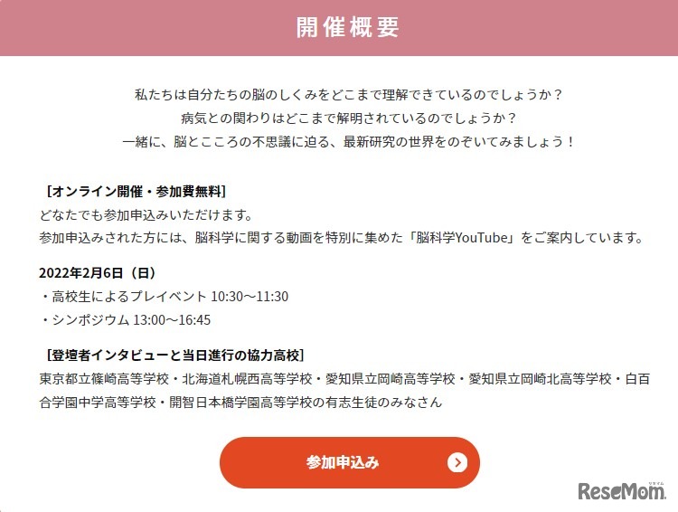 自然科学研究機構生理学研究所と理化学研究所脳神経科学研究センターは2022年2月6日、高校生以上を対象に「脳とこころの不思議に迫る」と題し、精神・神経疾患の解明に向けた最新研究を公開するシンポジウムをオンライン開催する。参加費無料。