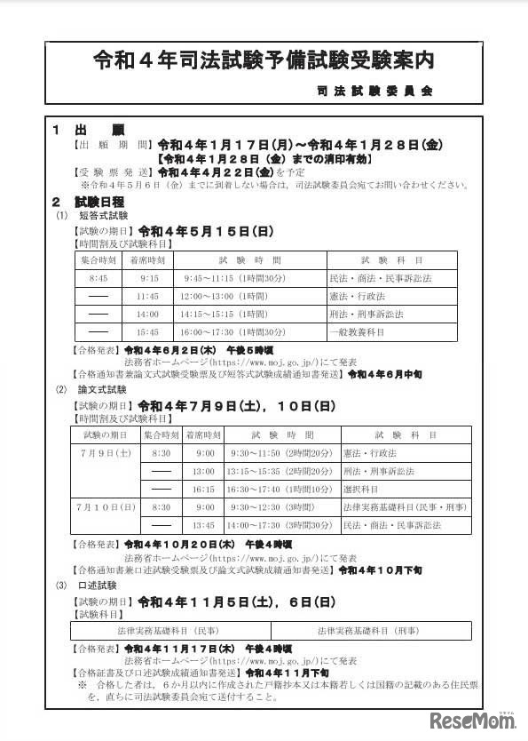 法務省は、2022年(令和4年)の司法試験予備試験の受験案内について公表した。出願期間は2022年1月17日~28日(消印有効)。受験票の発送は4月22日を予定している。