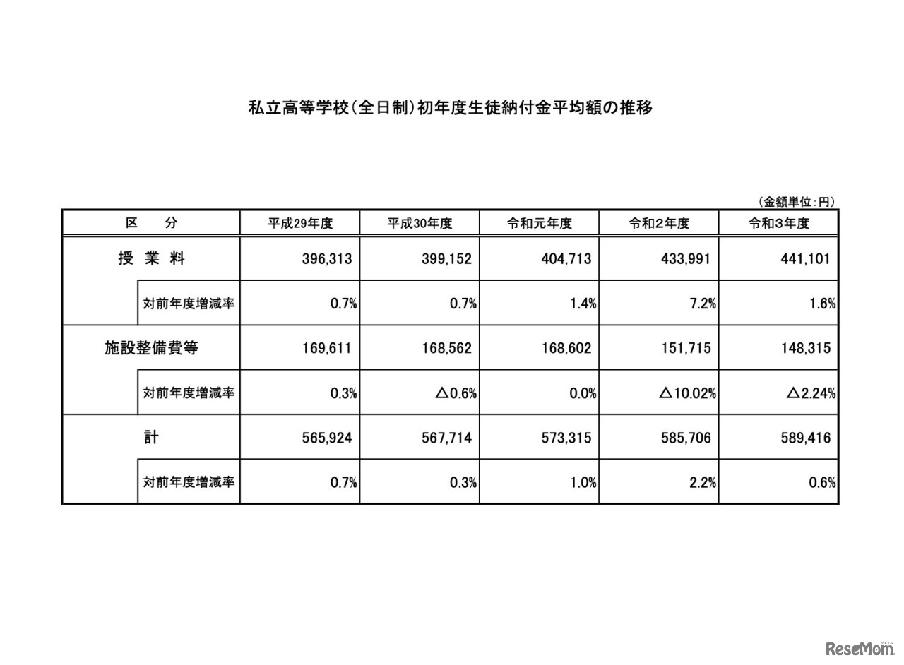 文部科学省は2021年12年24日、2021年度(令和3年度)私立高等学校等初年度授業料等の調査結果について公表した。高等学校(全日制)の初年度生徒等納付金の平均額は75万2,696円で、前年度より3,772円(0.5%)増加した。