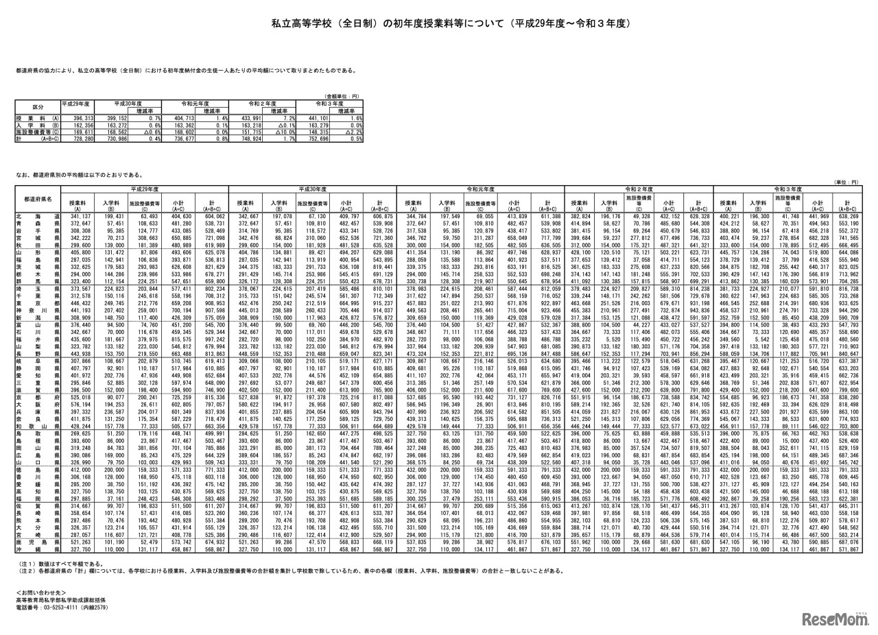 私立高等学校(全日制)の初年度授業料等について(平成29年度~令和3年度)