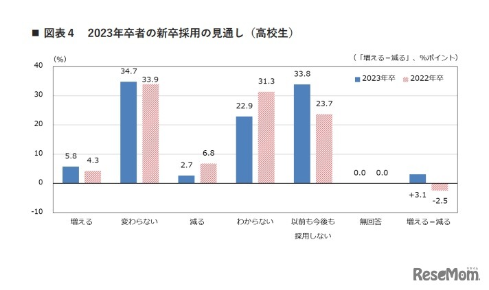 リクルートワークス研究所は2021年12月22日、2023年卒の新卒者(大学生・大学院生)を対象とした採用見通しに関する調査結果を公表。前年と比較して、新卒採用数が「増える」企業が10.9%あり、前年より「増える」が「減る」を上回った。