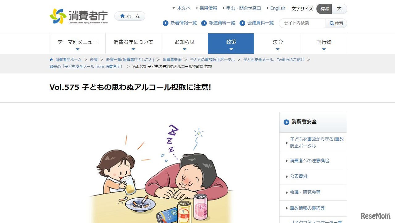 消費者庁は2021年から2022年にかけての年末年始を前に、「子供の思わぬアルコールの摂取」について、急性アルコール中毒等の事故を防ぐため注意を呼び掛けている。