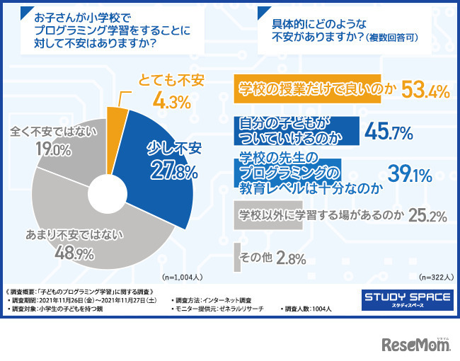 「お子さんが小学校でプログラミング学習をすることに対して不安はありますか?」「具体的にどのような不安がありますか?(複数回答可)」