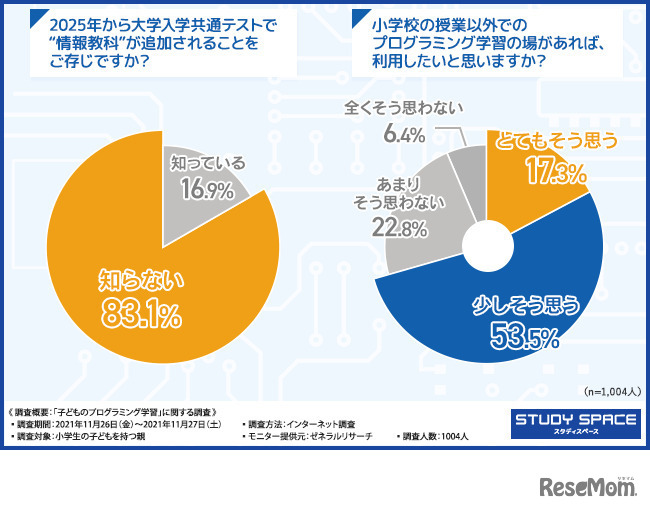 「2025年から大学入学共通テストで“情報教科”が追加されることをご存じですか?」「小学校の授業以外でのプログラミング学習の場があれば、利用したいと思いますか?」