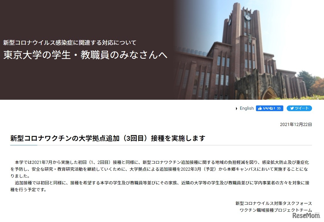 東京大学は2021年12月22日、新型コロナワクチンの大学拠点追加(3回目)接種を2022年3月から実施することを公表した。追加接種は、接種を希望する同大学の学生、教職員等とその家族、近隣大学の学生等を対象に行う予定。