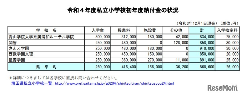 画像出典:埼玉県 2022年度私立小学校初年度納付金の状況