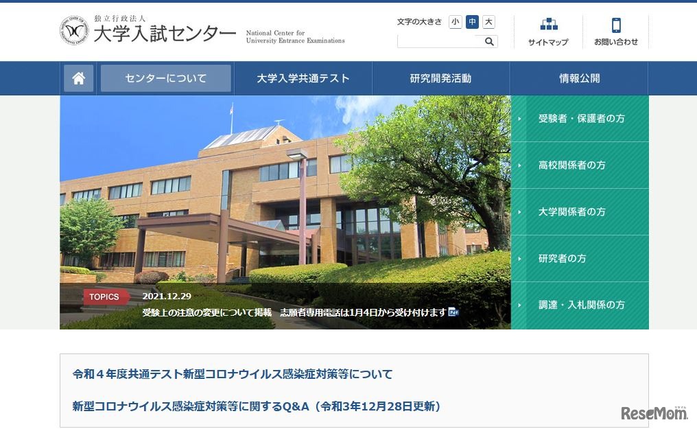 大学入試センターは2021年12月28日、2022年度(令和4年度)大学入学共通テストにおける「受験上の注意」の変更、「新型コロナウイルス感染症対策等」の一部改正、「新型コロナウイルス感染症対策等に関するQ&A」の更新について公表した。