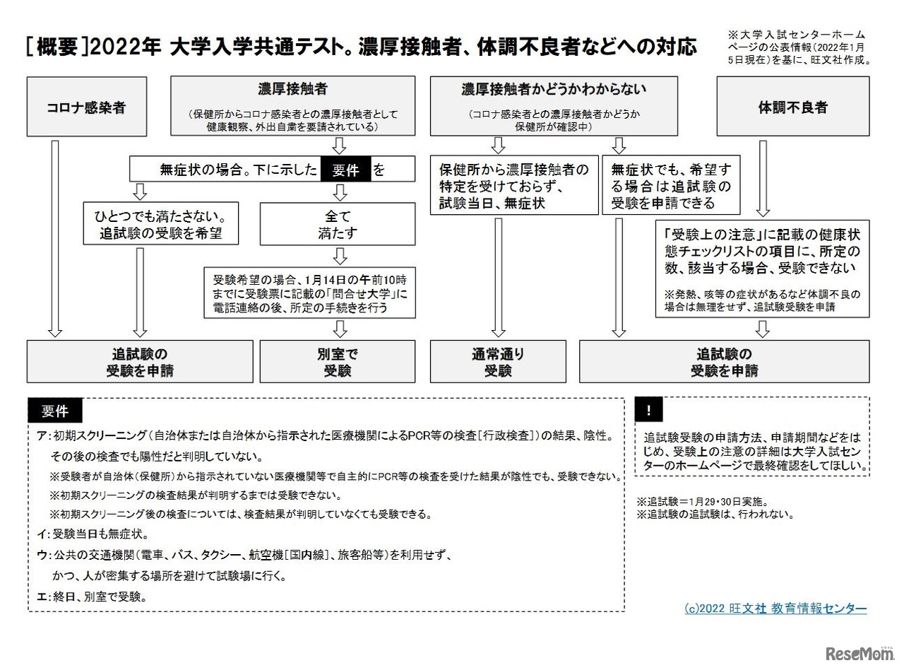 旺文社教育情報センターは2022年1月6日、「コロナ下での共通テスト 濃厚接触者等への対応の概要」をWebサイトに掲載した。フローチャートも示しながら、濃厚接触者や体調不良者等の受験可否や要件等を解説している。