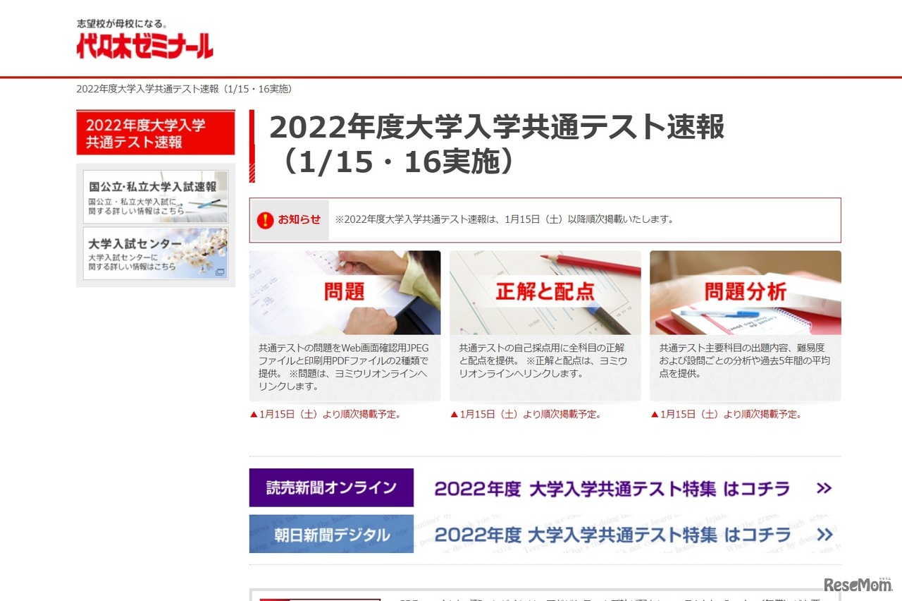 代々木ゼミナールは、2022年1月15日と16日に実施される2022年度大学入学共通テスト(旧センター試験)について、問題・正解と配点・問題分析を1月15日以降順次Webサイトに掲載する。