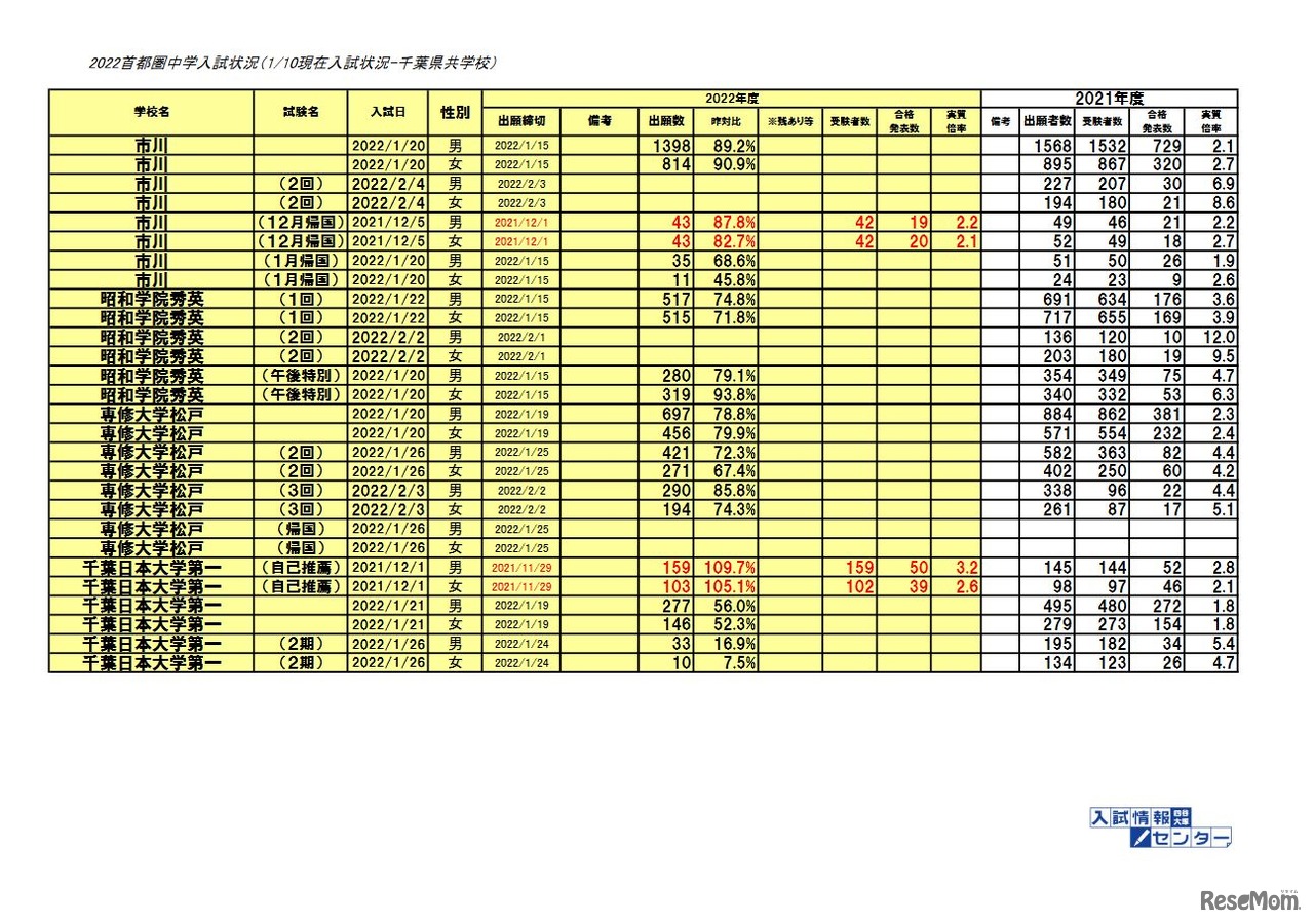 四谷大塚は2022年1月10日、1月20日にスタートする千葉県の私立中学校について、1月9日段階での主要校の出願者数を公表した。市川(1回)は男子1,398人、女子814人、東邦大学付属東邦(前期)は男女あわせて2,076人。各校とも締切りに向け出願者数は今後も増える見通し。