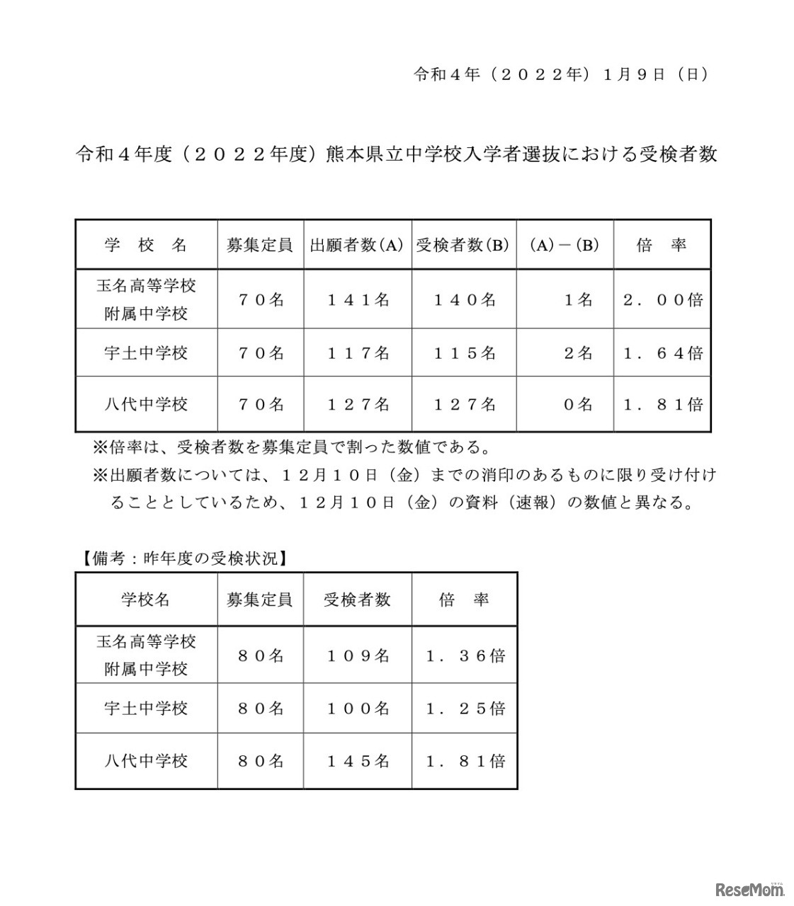 熊本県教育委員会は2022年1月9日、同日に行われた2022年度熊本県立中学校入学者選抜における受検者数について公表した。募集を行った3校の募集定員210人に対し、受検者数は382人で受検倍率は1.82倍。もっとも受検倍率が高かった玉名高等学校附属中学校は2.00倍となった。