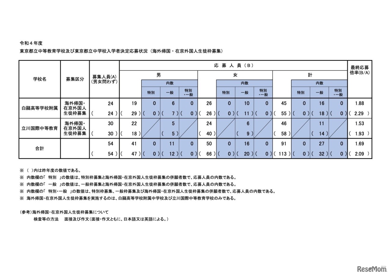 東京都教育委員会は2022年1月11日、2022年度(令和4年度)東京都立中等教育学校および東京都立中学校入学者決定応募状況(海外帰国・在京外国人生徒枠募集)について発表した。最終応募倍率は1.69倍。検査は1月25日に行われる。
