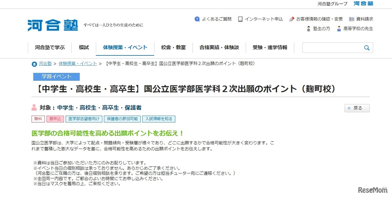 河合塾麹町校は2022年1月20・22・23・29日、国公立大医学部医学科への2次出願のポイントを伝えるイベントを開催する。参加は無料で、事前申込が必要。Webサイトまたは電話より申し込む。