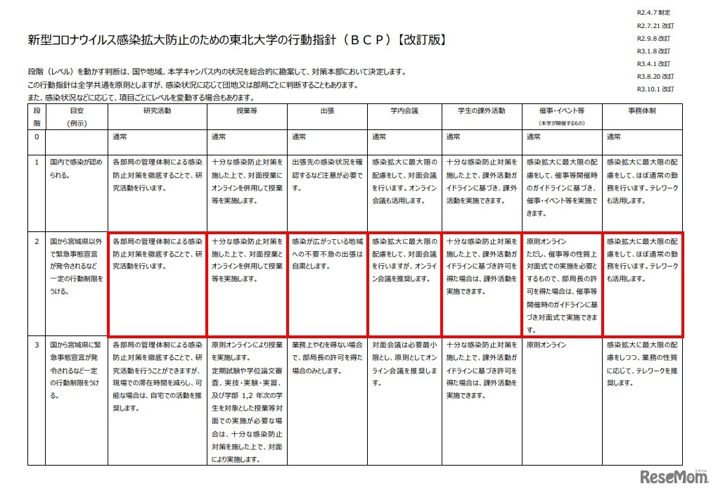 東北大学は2022年1月18日、全国でオミクロン株の新規感染者数が急増していることから、行動指針をレベル2に引き上げることを公表した。東京大学は、感染を広げないために学生や教職員へ注意喚起を促している。国立大学の感染拡大防止の対応をまとめた。