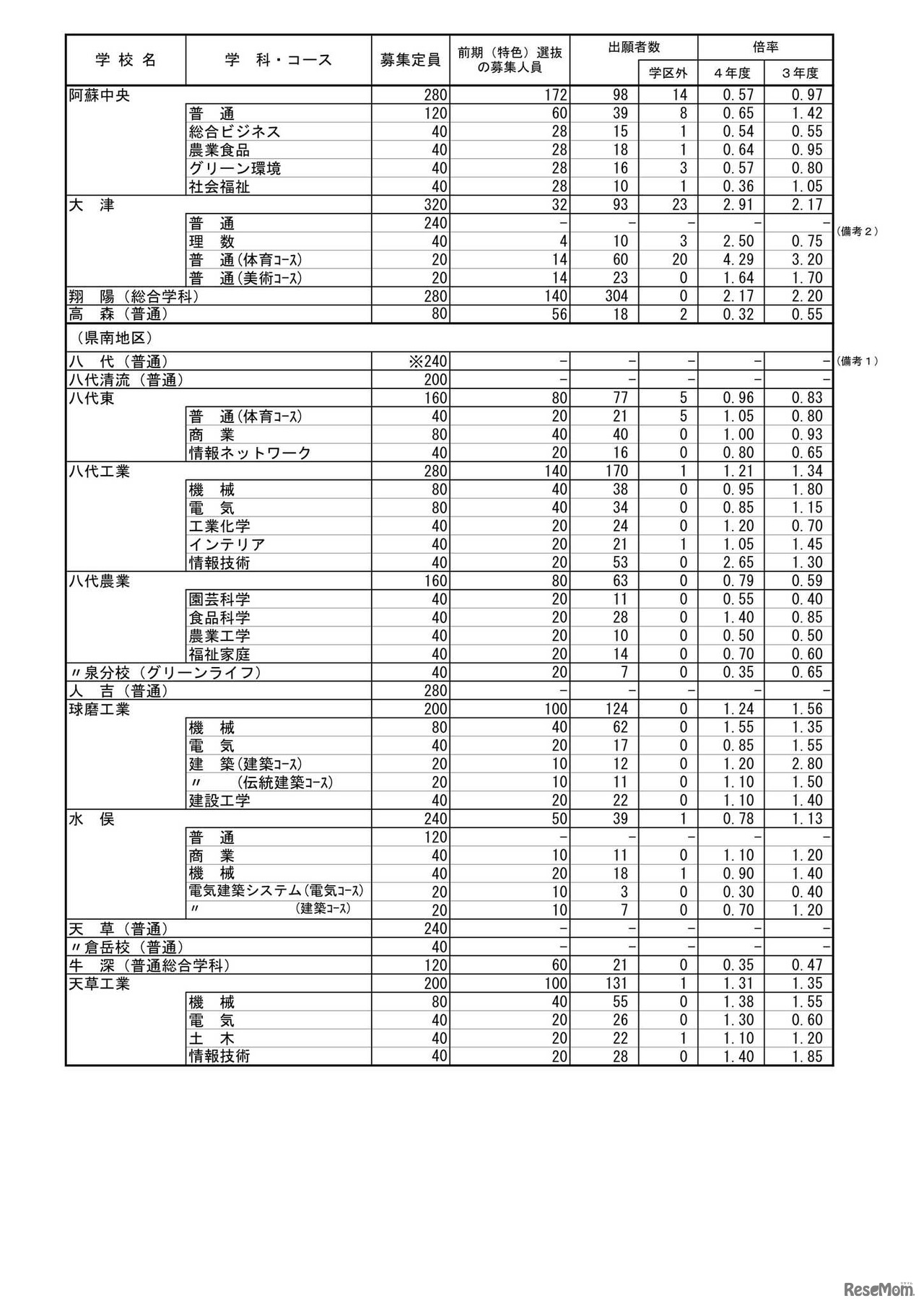 画像出典:熊本県 熊本県 令和4年度公立高等学校入学者選抜の前期(特色)選抜出願状況
