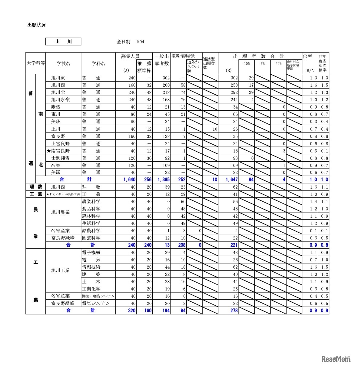 画像出典:北海道教育委員会「令和4年度 公立高等学校入学者選抜の出願状況」 上川学区