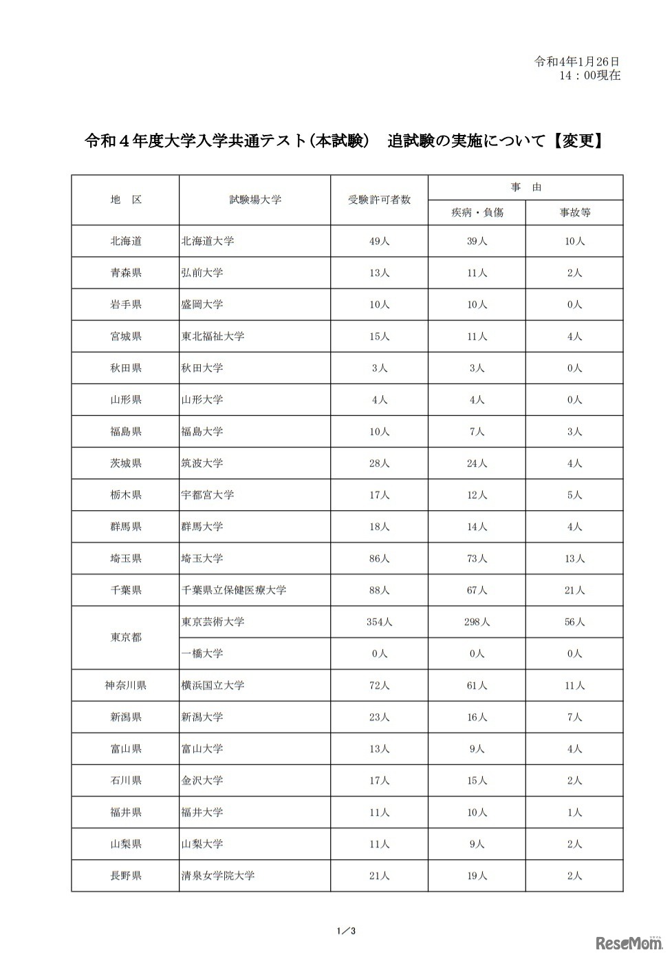 大学入試センターは、2022年度(令和4年度)大学入学共通テスト追・再試験の正解を公表した。1月26日午後2時現在、追試験は49大学で実施、受験許可者数は1,658人。再試験は6大学の対象者267人のうち10人が受験を希望した。