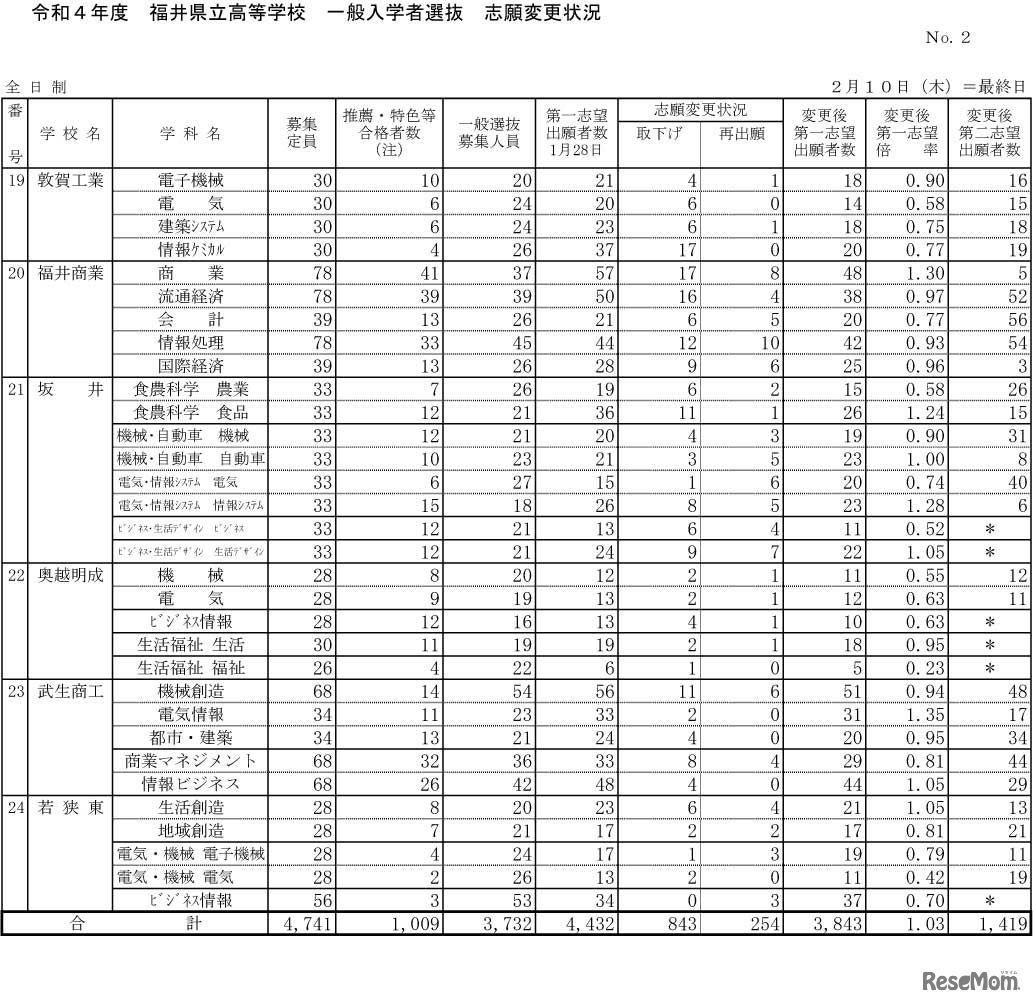 画像出典:福井県教育委員会 令和4年度 福井県立高等学校 一般入学者選抜 志願変更状況