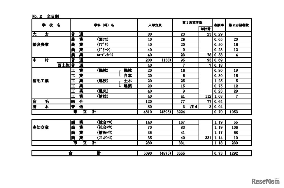高知県教育委員会は2022年2月10日、令和4年度(2022年度)高知県公立高等学校入学者選抜A日程等の確定志願状況を発表した。志願変更受付最終日の2月10日現在、全日制課程全体の志願倍率は0.73倍。