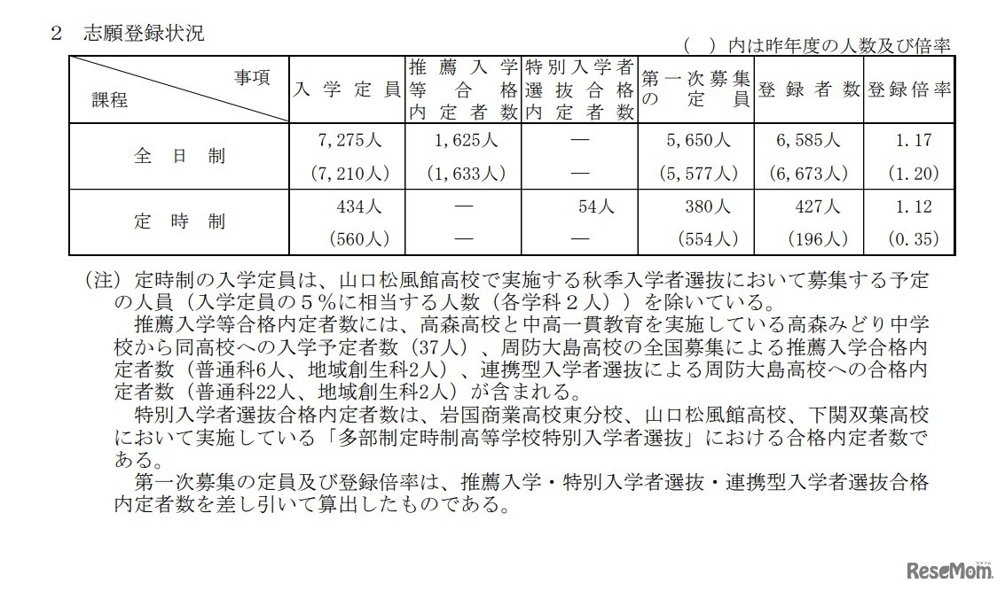 山口県は2022年2月16日、2022年度(令和4年度)山口県公立高等学校入学志願登録者数および推薦入学・特別入学者選抜・連携型入学者選抜合格内定者数について発表した。全日制課程における第1次募集の定員5,650人に対して登録者数は6,585人、登録倍率は1.17倍となった。