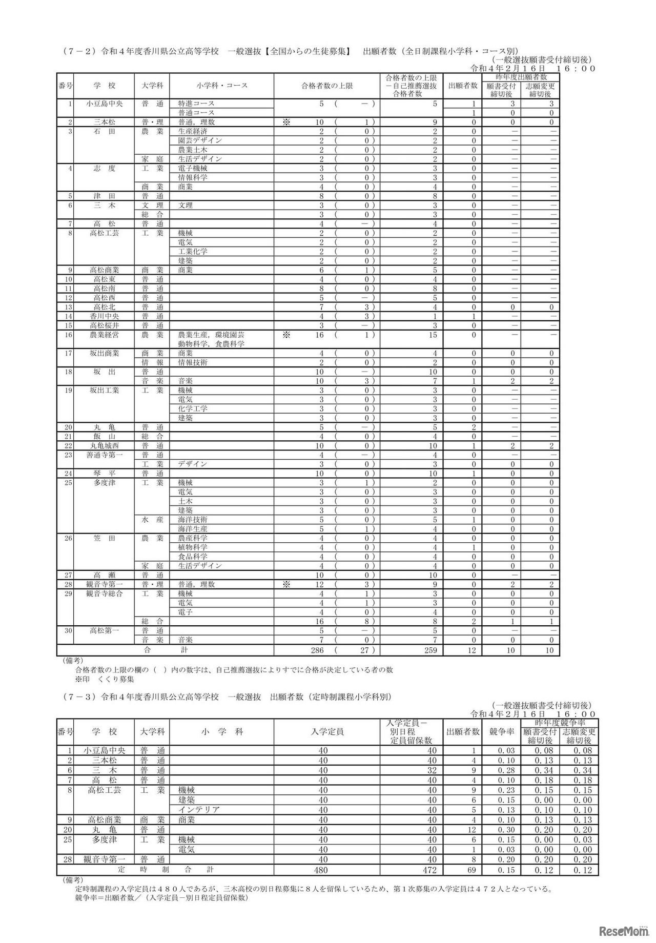 香川県教育委員会は、2022年度(令和4年度)香川県公立高校一般選抜について、2月16日午後4時の最終出願状況・倍率を発表した。全日制課程における一般選抜の全体倍率は1.13倍。