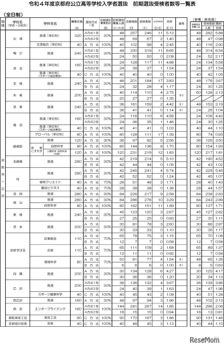 令和4年度京都府公立高等学校入学者選抜(前期選抜)受検者数等一覧