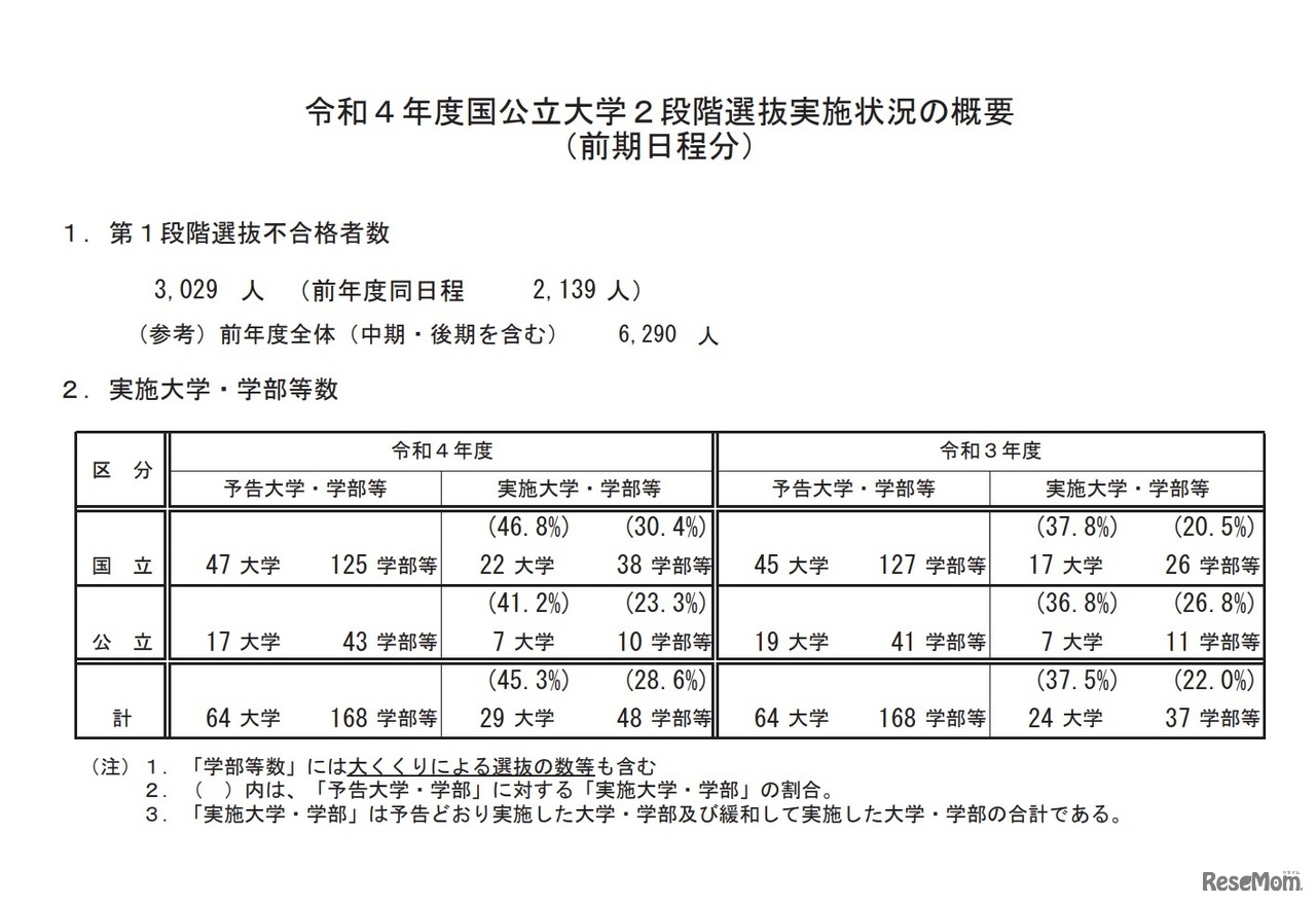文部科学省は2022年2月22日、2022年度(令和4年度)国公立大学入学者選抜2次試験の確定志願状況と2段階選抜実施状況について発表した。確定志願倍率は、前期日程が2.9倍、後期日程が10.0倍、中期日程が13.4倍、合計4.3倍であった。