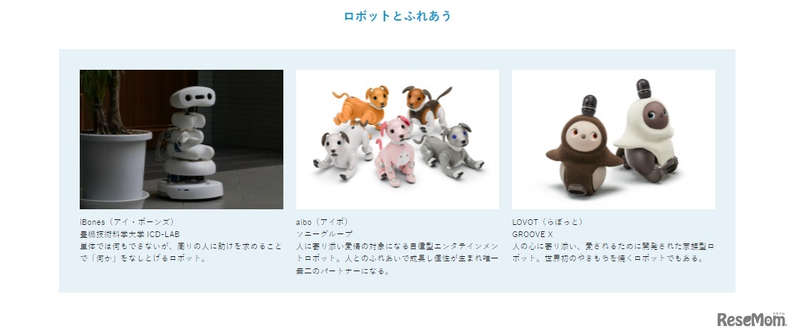 画像出典:日本科学未来館 写真左から、iBones(アイ・ボーンズ)、aibo(アイボ)、LOVOT(らぼっと)