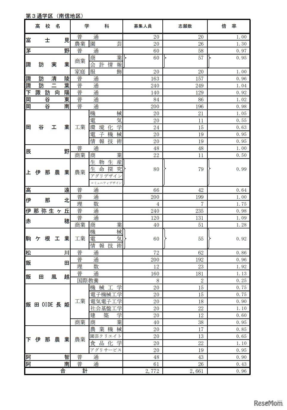長野県教育委員会は2022年2月25日、令和4年度(2022年度)公立高等学校入学者後期選抜における志願状況(志願変更前)を発表した。全日制は、募集人員1万203人に対して1万56人が志願し、志願倍率は0.99倍。