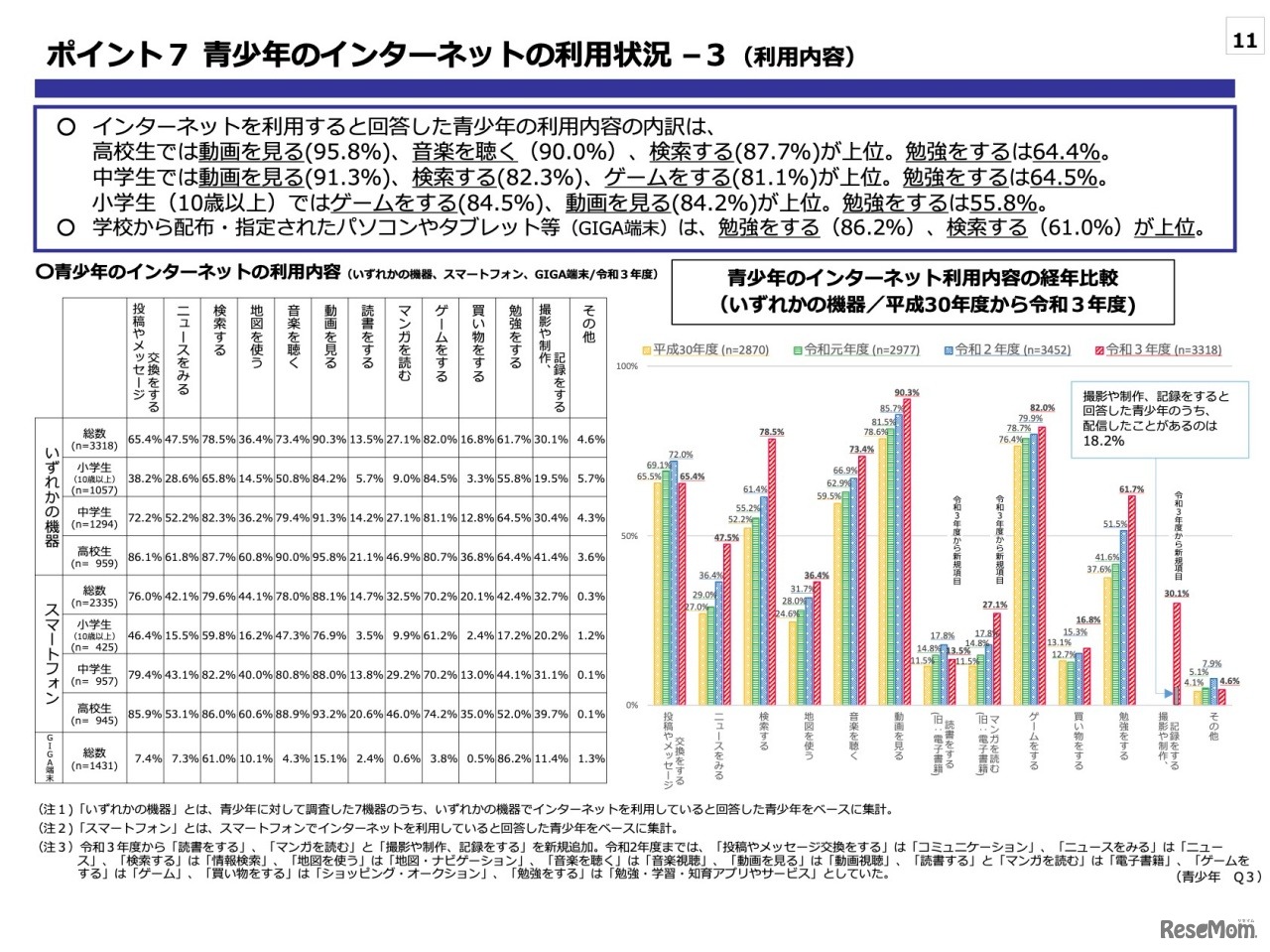 内閣府は2022年2月28日、2021年度「青少年のインターネット利用環境実態調査」の結果(速報)を公表した。インターネットの利用時間は小・中・高生のいずれも前年度より約1時間増加。高校生は1日平均約5時間31分だった。GIGA端末の利用率は小学生50.0%、中学生48.0%。