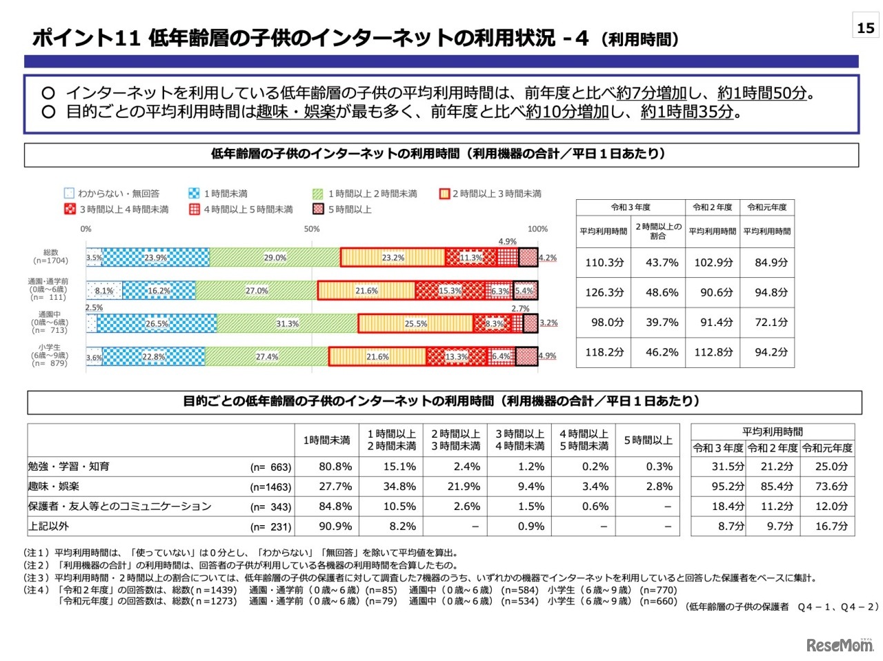 画像出典:内閣府「令和3年度 ⻘少年のインターネット利⽤環境実態調査調査結果(速報)」 低年齢層の⼦供のインターネットの利⽤状況-4(利⽤時間)