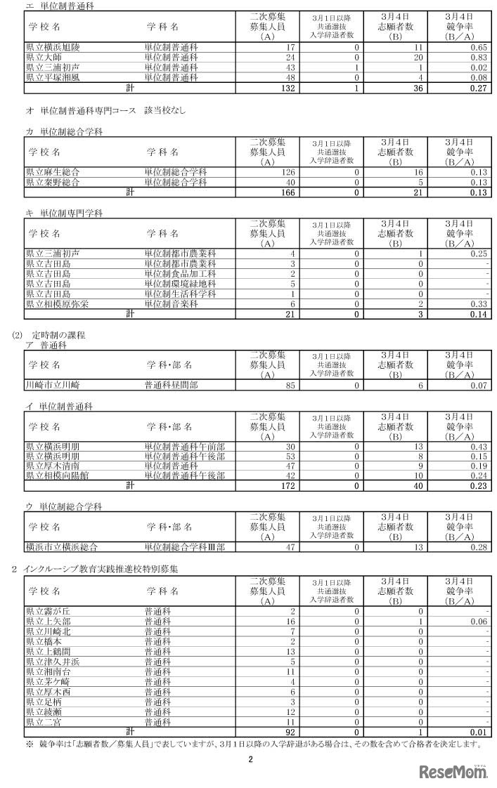 令和4年度神奈川県公立高等学校入学者選抜一般募集共通選抜及びインクルーシブ教育実践推進校特別募集二次募集志願締切時志願状況
