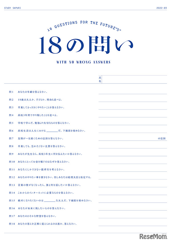 リクルートが提供するオンライン学習サービス「スタディサプリ」は2022年3月9日、全国の卒業を迎える高校3年生に向けたメッセージ企画「18の問い」を公開した。ムービーを通じて、この春に卒業を迎える18歳の価値観や考え方に触れることができる。