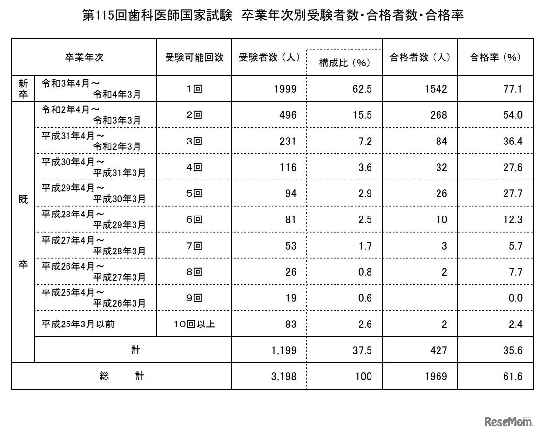 第115回歯科医師国家試験 卒業年次別受験者数・合格者数・合格率