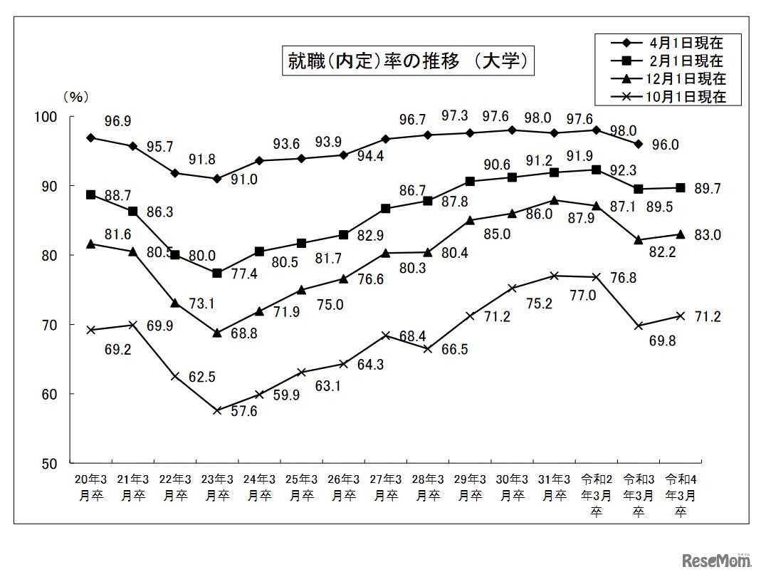 文部科学省と厚生労働省は2022年3月18日、2022年3月大学等卒業予定者の就職内定状況(2月1日現在)を公表した。大学生の就職内定率は、前年同期比0.2ポイント増の89.7%。2年ぶりに前年同期を上回ったものの、微増にとどまった。