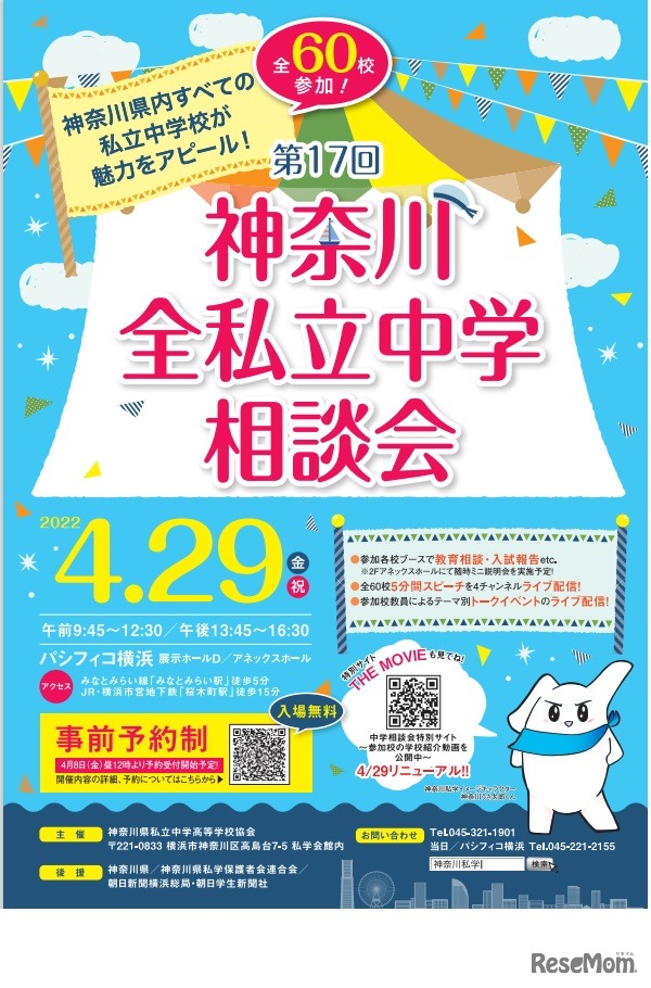 神奈川県私立中学高等学校協会は2022年4月29日、パシフィコ横浜で、「神奈川全私立中学相談会」を開催する。ブースでは臨時説明会、個別相談も実施予定。オンラインではライブ・オンデマンド配信も行う。入場料無料。事前予約制。