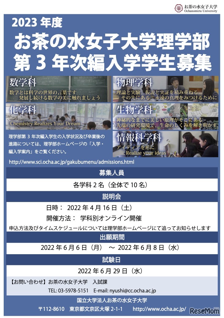 お茶の水女子大学は2022年4月16日、2023年度の理学部第3次編入学説明会を開催する。説明会は学科別にオンラインで開催。事前申込必須。